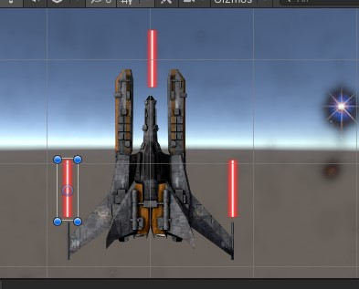 After the drag and drop from Prefabs to the Hierarchy, and a duplication (press ctrl-D), and a repositioning (rect. tool) to originate three lasers from the three corners of the Player ship, we have this triple laser shot: