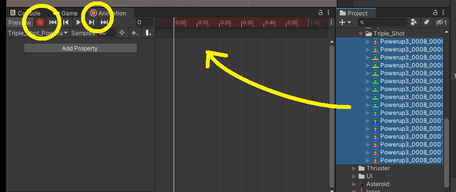 The animation now appears in the assets pane with its “Triple_Shot_powerup” controller.