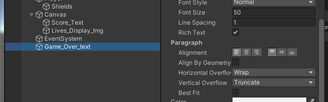 To avoid seeing the “GAME OVER” text before running the game, highlight the “Game_Over_text” object in the Hierarch, and uncheck the object’s box in the Inspector.