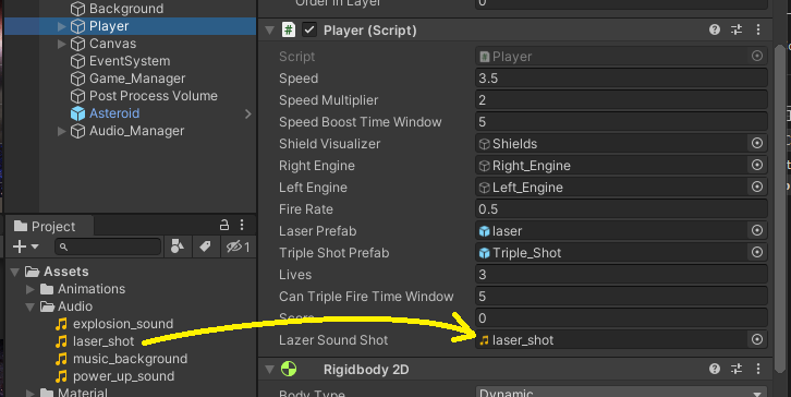 Do drag and drop the lazer_shot to the Player (Script) variable “_lazerSoundShot.”